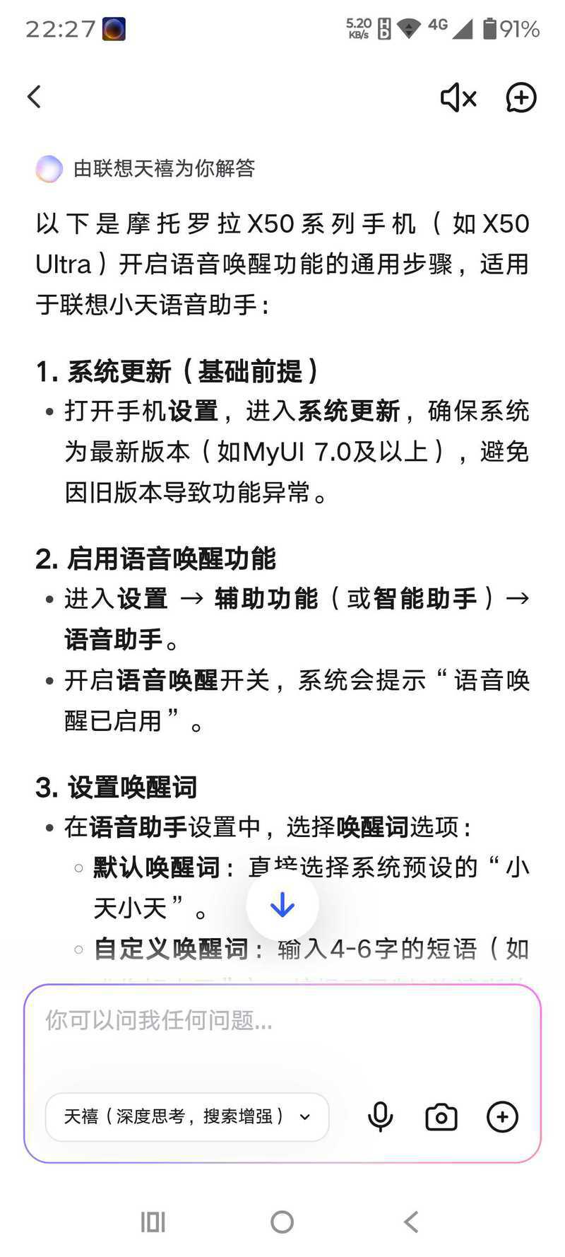 我的moto X50 Ultra,找不到语音唤醒,就问了自带的“天禧”,结果它告诉我可以,并且告诉我开启方法,结果我找不到这些菜单。算是联想虚假宣传吗?